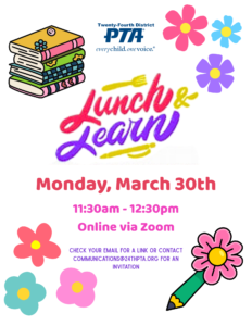 Join Twenty-Fourth District PTA officers via Zoom on Monday, March 30th from 11:30am – 12:30pm for an informal Q&A session. Grab your lunch and join us online to learn more about PTA, meet fellow leaders and get your questions answered!